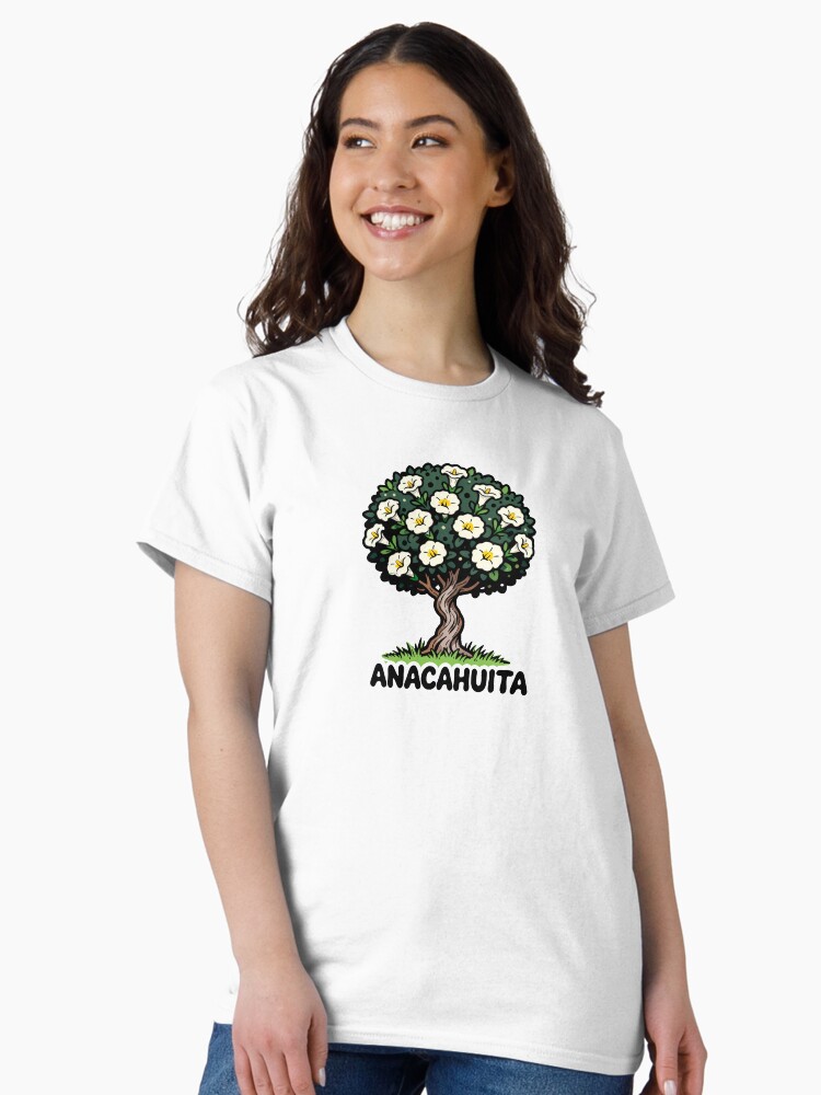 The subtle beauty of the Anacahuita (Cordia boissieri) meets the dynamic energy of 80s retro style in this exclusive t-shirt from Conciencia.eco. Known for its delicate white flowers that resemble tissue paper, the Anacahuita is a treasure of Northeast Mexico and South Texas. Our Anacahuita Tree Illustration T-Shirt captures that botanical essence and transforms it into a vibrant cartoon graphic that pays homage to late-century pop culture and radical design.