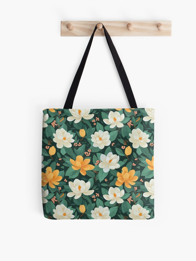 La Magnolia es una declaración de estilo por derecho propio. En Conciencia.eco, hemos creado una variante de patrón botánico que combina la pureza de las magnolias blancas con vibrantes flores anaranjadas sobre un fondo verde profundo. Esta bolsa tote bag con ilustración de flor es una interpretación clásica y a la vez moderna de la flora ornamental, diseñada para quienes buscan un accesorio que destaque por su riqueza cromática y su equilibrio visual. El contraste entre los tonos crema y el follaje oscuro crea una sensación de profundidad y elegancia, convirtiendo cada uso en una oportunidad para celebrar la diversidad y el diseño inspirado en la naturaleza.
