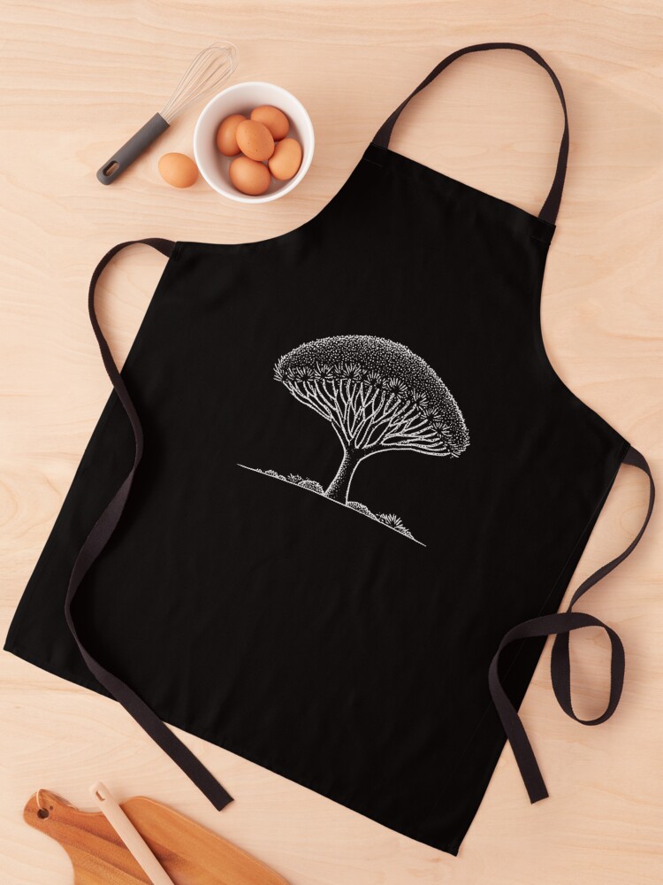 Mística canaria en tu cocina. Delantal con ilustración de Árbol Drago en técnica de puntillismo, ideal para amantes de la botánica milenaria y el diseño con alma.