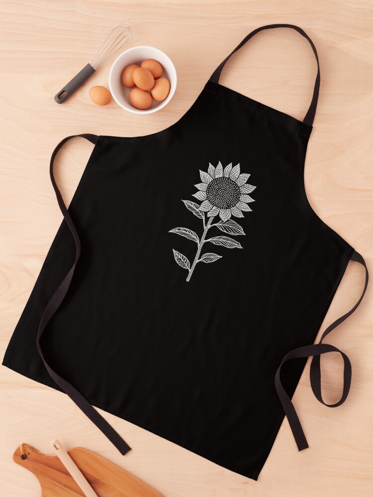 Irradia optimismo en tus tareas diarias. Delantal de girasol en técnica de puntillismo, una pieza de arte botánico ideal para la cocina y el jardín.