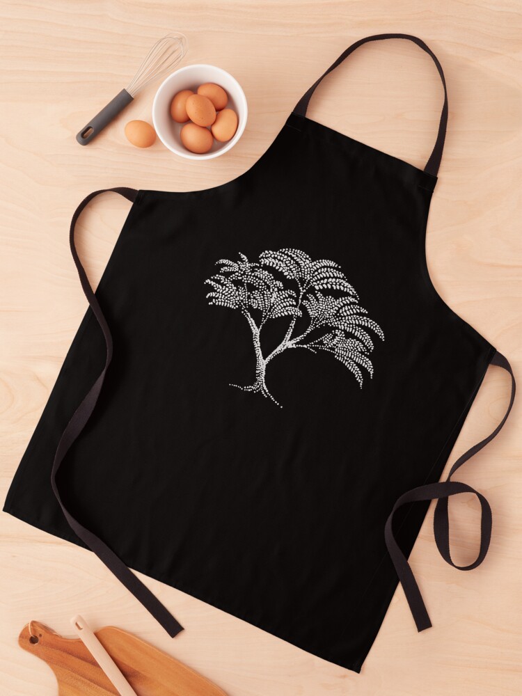 El Flamboyán (Delonix regia), también conocido como Árbol del Fuego, es el símbolo supremo de la espectacularidad tropical y la alegría del verano. Con su copa en forma de sombrilla y su floración roja intensa, representa la pasión y la luz. En Conciencia.eco, hemos querido capturar esa silueta expansiva mediante la técnica del dot-art o puntillismo. Esta ilustración de Flamboyán en blanco y negro despoja al árbol de su color habitual para centrarse en la asombrosa estructura de sus hojas plumosas y sus racimos florales. Este delantal con ilustración de árbol pertenece a nuestra serie ‘Pointillism & Dot-Art: Ink Series’, diseñada para personas que buscan una estética sofisticada, minimalista y llena de energía para su hogar.