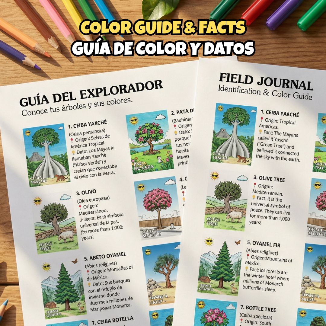 - Contenido Bilingüe (Español e Inglés): Todos los nombres de los árboles y los datos curiosos están presentados en ambos idiomas, fomentando el vocabulario bilingüe desde una edad temprana.