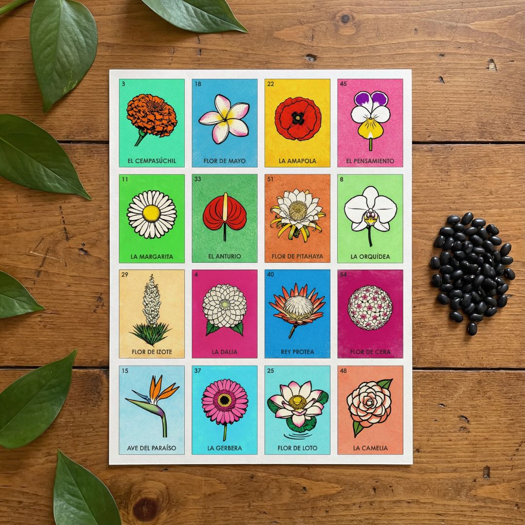 Tradición y color en cada carta. Lotería de flores ilustrada en estilo tradicional, con 20 tablas y versos incluidos. Descarga PDF, imprime y celebra la biodiversidad de México.