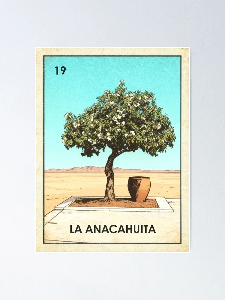La Anacahuita (Cordia boissieri), también conocida como el olivo mexicano, es una de las joyas botánicas más queridas de las regiones semiáridas. Sus flores blancas, de textura delicada similar al papel y centros amarillos, son el corazón de esta ilustración. En esta entrega de nuestra colección, presentamos un póster de árbol anacahuita estilo ilustración de lotería mexicana que exhala frescura, hospitalidad y una identidad regional muy marcada, ideal para iluminar cualquier rincón con un toque orgánico y sofisticado.