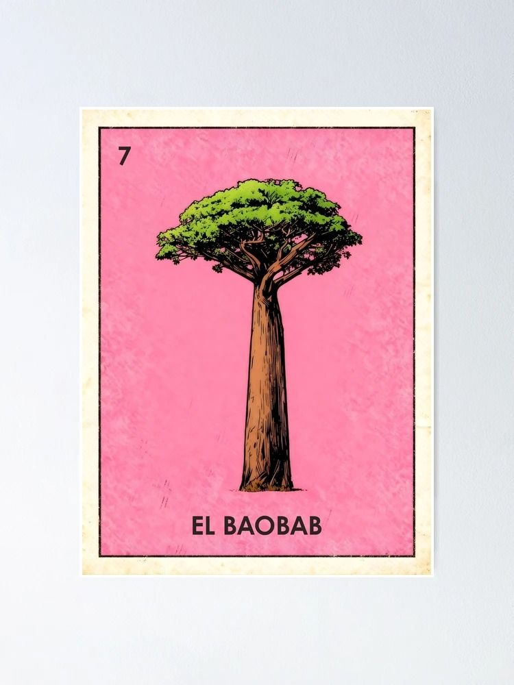 El Baobab (Adansonia), ese gigante prehistórico que parece crecer al revés, llega a nuestra colección como un monumento a la longevidad y la resistencia. En Conciencia.eco, hemos rendido tributo al llamado «Árbol de la Vida» integrándolo en el universo visual de la gráfica tradicional latina. Este póster de un Baobab con estilo de lotería mexicana es una pieza de diseño poderosa, donde el tronco masivo y las ramas desnudas de la especie se presentan con la fuerza de un icono cultural, rodeado por el marco clásico que evoca la nostalgia de las ferias de antaño y los juegos de azar con historia.