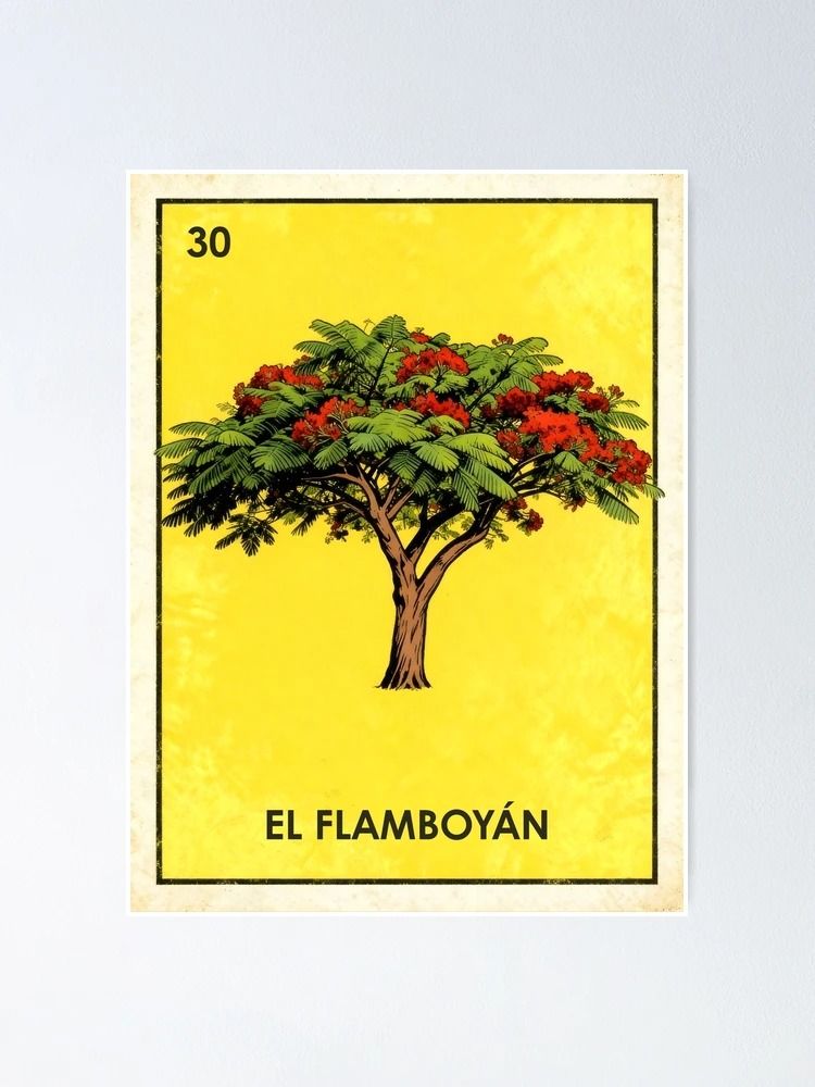 La combinación del Flamboyán con la estética de la lotería mexicana crea un objeto de diseño con una personalidad arrolladora. Este póster de un árbol Flamboyán al estilo lotería es ideal para quienes buscan piezas que no pasen desapercibidas y que cuenten una historia de pertenencia y amor por la biodiversidad. Las líneas audaces y la saturación del color evocan los mercados, las plazas y los paisajes tropicales donde este árbol es el rey indiscutible. Es una obra de arte con alma, diseñada para quienes aman los objetos con historia y contexto cultural, aportando un toque «latino-chic» sofisticado y auténtico.