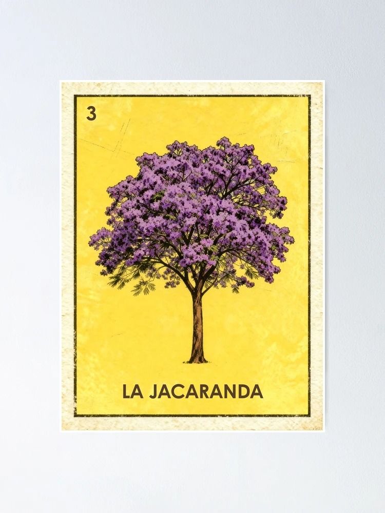 La Jacaranda (Jacaranda mimosifolia) es, sin duda, la reina de la primavera en muchas ciudades de América Latina. Su floración violeta transforma el paisaje urbano en un escenario onírico, llenando las calles de una alfombra de flores que anuncia la renovación de la vida. En Conciencia.eco, hemos querido inmortalizar este momento mágico bajo la estética del arte popular. Este póster de jacaranda con diseño de lotería mexicana captura la delicadeza de sus flores y la elegancia de su copa, ofreciendo una pieza de diseño que irradia alegría, frescura y una profunda nostalgia por la ciudad en flor.