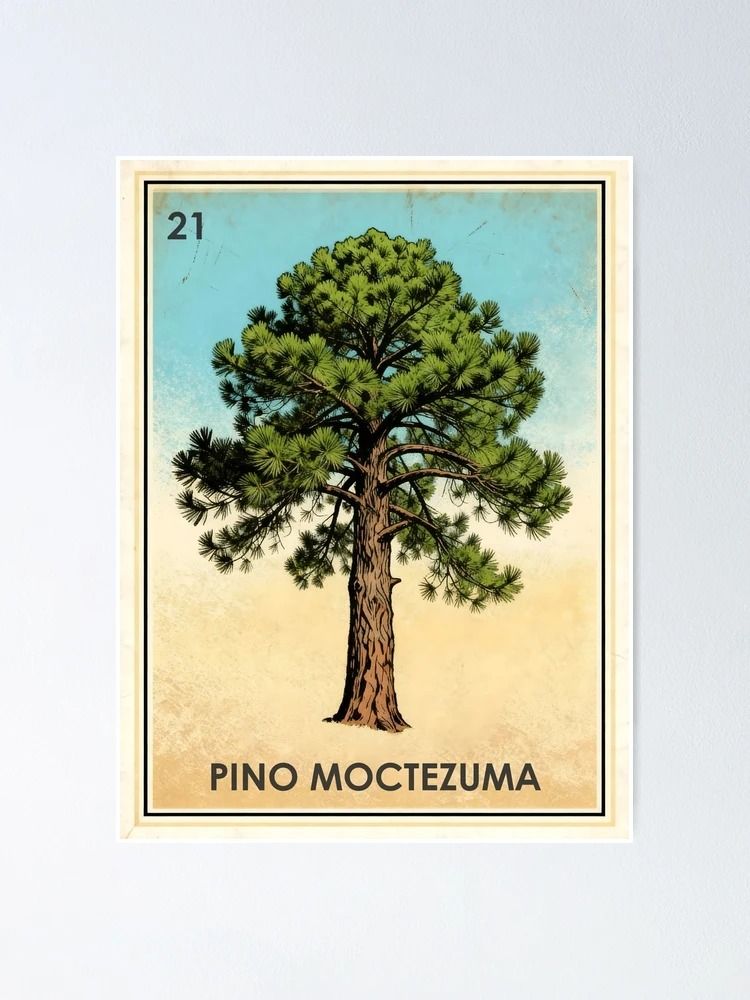 El Pino Moctezuma (Pinus moctezumae), también conocido tradicionalmente como ocote, es mucho más que una conífera; es un símbolo de la identidad forestal de las tierras altas de México. En Conciencia.eco, hemos querido rendir tributo a esta especie legendaria integrándola en la iconografía de nuestra serie inspirada en el arte popular. Este póster de Pino Moctezuma con estética de lotería captura la elegancia de sus largas acículas y la robustez de su tronco, ofreciendo una pieza de diseño que celebra la riqueza de nuestras montañas con un toque de nostalgia cultural inigualable.