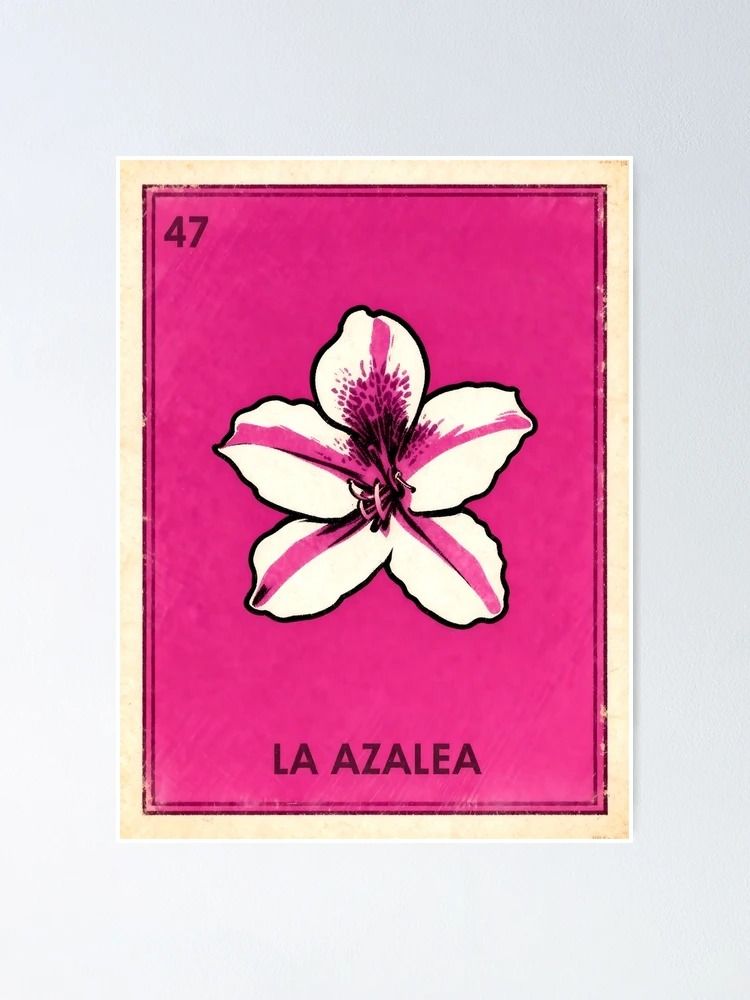Lo que hace especial a esta pieza es su capacidad para elevar una flor de jardín clásica a la categoría de icono gráfico de alto impacto. Este póster de la flor de azalea estilo lotería mexicana rompe con los esquemas de la ilustración botánica convencional para ofrecer algo más cálido y decorativo. Su diseño permite que funcione de maravilla en ambientes modernos que buscan un toque de folklore refinado. La tipografía clásica y el borde definido del juego de la lotería añaden una narrativa visual que invita a recordar los patios floridos y las casas de antaño, convirtiendo una simple rama de azalea en un objeto de arte que celebra la identidad con un estilo inconfundible.