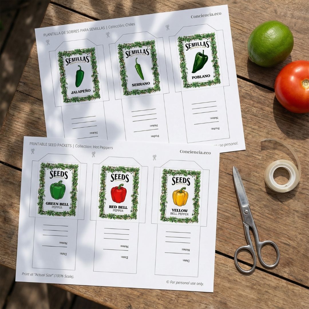 La pasión por el huerto y la jardinería comienza con el respeto por las semillas y su correcta preservación. En Conciencia.eco, hemos diseñado este Kit de Sobres para Semillas Imprimibles perteneciente a nuestra colección especial de chiles picantes, una herramienta indispensable para el hortelano moderno que valora tanto la funcionalidad como la estética decorativa. Este producto digital es mucho más que una simple plantilla de papel; es una invitación formal a practicar la soberanía alimentaria y la conservación de variedades botánicas con un diseño profesional, artístico y lleno de color. Cada sobre ha sido ilustrado meticulosamente para resaltar la vibrante personalidad de los diferentes tipos de chiles, permitiéndote clasificar tus semillas recolectadas o personalizar tus compras a granel con un toque de distinción visual que transformará tu banco de semillas en una verdadera colección de arte botánico digna de ser mostrada.